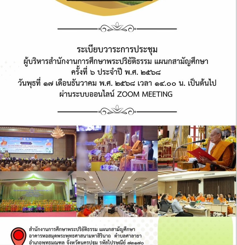 วันที่ ๑๖ ธันวาคม ๒๕๖๘ ประธานเขตการศึกษาพระปริยัติธรรม แผนกสามัญศึกษา เขต๑ และ ๑๔ พร้อมด้วยครู บุคลากรทางการศึกษา เข้าร่วมประชุมคณะกรรมการพิจารณาคัดเลือกผู้รับทุนการศึกษาเฉลิมราชกุมารี ระยะที่ ๒ (รุ่นที่ ๑๐) ประจำปีการศึกษา ๒๕๖๙