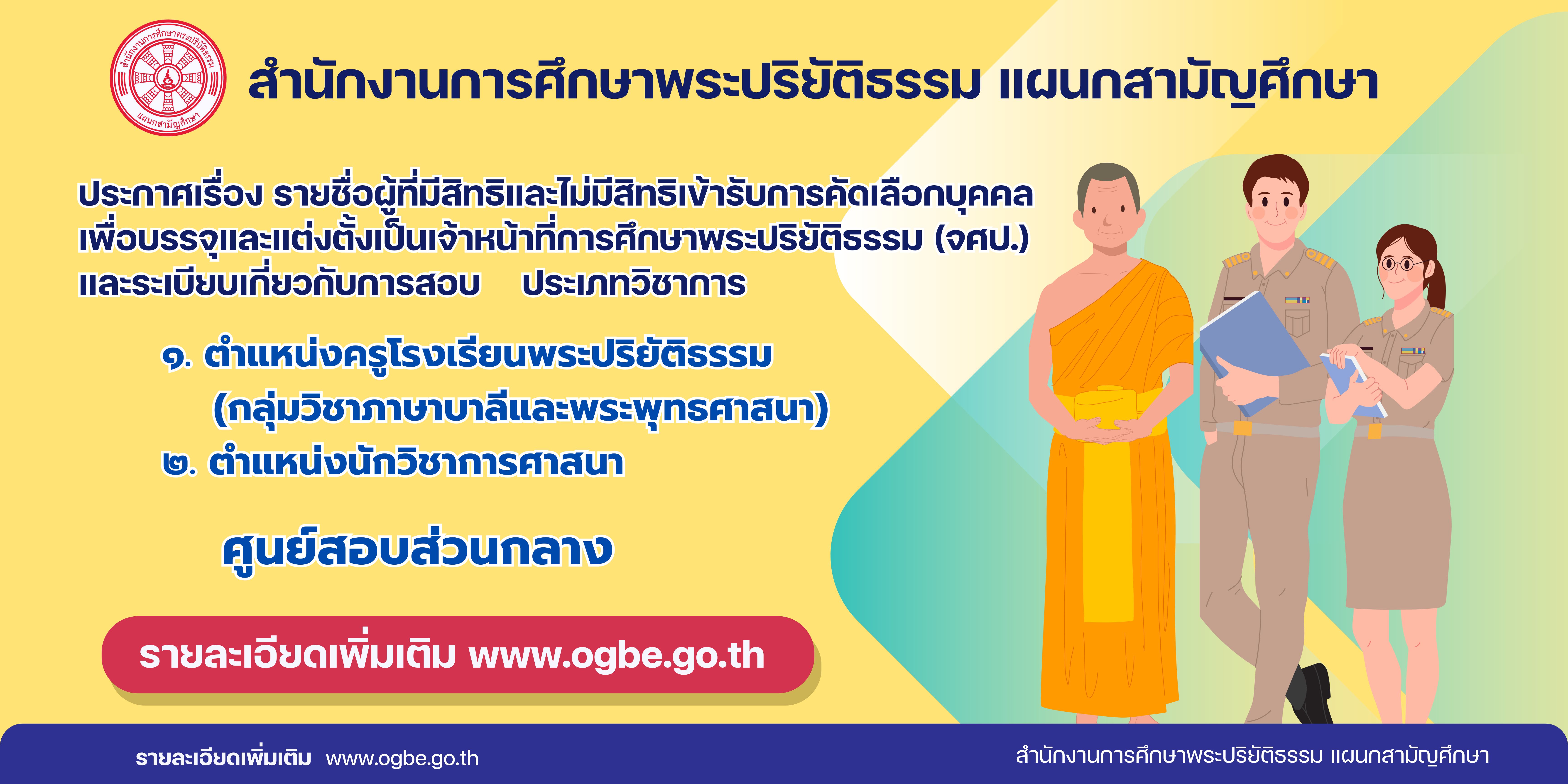 ประกาศ รายชื่อผู้มีสิทธิและไม่มีสิทธิเข้ารับการคัดเลือก ในการคัดเลือกบุคคลเพื่อบรรจุและแต่งตั้งเป็นเจ้าหน้าที่การศึกษาพระปริยัติธรรม (จศป.)